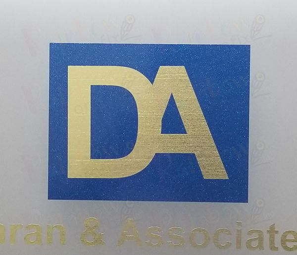 Brushed Gold Vinyl Lettering done on frosted plexiglass mounted on wall with metal studs. Good option for indoor reception and lobby area.