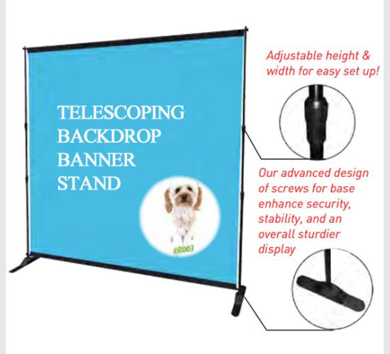Telescoping Backdrop banner stand are portable, economical, cost effective and durable for years to come. Has ability to be used as both side dis-player. Adjustable width and height. The frame is designed for stability, easy set up and transportation. Complimentary carry bag allows for convenient travel.